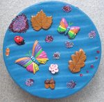 2012Ocean drum "Vlinder". Gemaakt van een kunststof schaal, versierd met gipsfiguurtjes, kraaltjes, knopen. Gevuld met gedroogde kruiden en bonen, als je de drum ronddraait krijg je een mooi geluid.